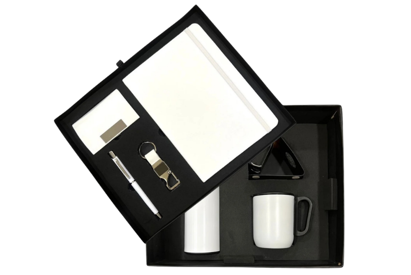 A joining kit is a welcome package for new employees containing essential items like notebooks, pens, company merchandise, and branded accessories. Our joining kit boxes can be customized with your company logo and include items like premium polo shirts, executive bags, customized flask bottles, and corporate stationery.